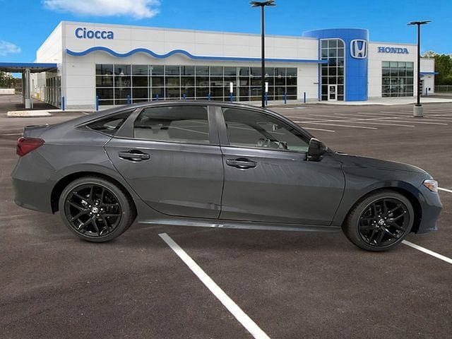 The 2026 Honda Civic Sport Sedan serves as the athletic entry in the non-hybrid lineup, powered by a 2.0-liter four-cylinder engine that delivers 150 horsepower and 133 lb-ft of torque. Paired with a continuously variable transmission (CVT), this trim includes a 3-Mode Drive System (ECON/Normal/Sport) and steering wheel-mounted paddle shifters for a more engaged driving experience. The exterior is defined by a bold, blacked-out aesthetic featuring 18-inch gloss-black alloy wheels, matte-black window trim, a chrome exhaust finisher, and heated power side mirrors with gloss-black caps. Inside, the cabin features sport-specific upgrades such as racing-inspired sport pedals, a leather-wrapped steering wheel, and a leather-wrapped shift knob. Standard technology includes a 7-inch color touchscreen with Apple CarPlay and Android Auto integration, a 180-watt 8-speaker audio system, and Smart Entry with Walk Away Auto Lock. For safety, the Sport trim comes equipped with the Honda Sensing suite, which includes adaptive cruise control with low-speed follow and a standard Blind Spot Information System with a rear cross-traffic monitor.