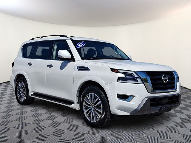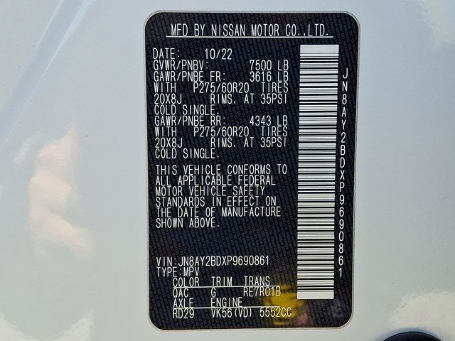 2023 Nissan Armada SL 4WD, Accident Free, Leather / Leatherette, One Owner, Apple Car Play, Rear Back-up Camera, Armada SL, 5.6L V8 DOHC 32V LEV3-ULEV125 400hp, 4WD, Aspen White, 13 Speakers, 3rd Row Carpeted Floor Mats - Bench Seat, 3rd row seats: split-bench, Auto High-beam Headlights, Auto tilt-away steering wheel, Auto-dimming Rear-View mirror, Auto-leveling suspension, Automatic temperature control, Bose 13-Speaker Premium Audio System, Brake assist, Cargo Package, Delay-off headlights, Electronic Stability Control, Exterior Parking Camera Rear, Front Bucket Seats, Front Center Armrest, Front dual zone A/C, Front fog lights, Fully automatic headlights, Garage door transmitter: HomeLink, Heated Front Bucket Seats, Heated front seats, Heated steering wheel, Illuminated entry, Illuminated Kick Plates, Leather-Appointed Seat Trim, Memory seat, Navigation System, NissanConnect featuring Apple CarPlay and Android Auto, Power driver seat, Power Liftgate, Power moonroof, Radio: NissanConnect w/SiriusXM, Rear seat center armrest, Rear window wiper, Speed-Sensitive Wipers, Telescoping steering wheel, Tilt steering wheel, Trip computer, Variably intermittent wipers, Voltmeter, Wheels: 20" x 8J Painted Alloy.